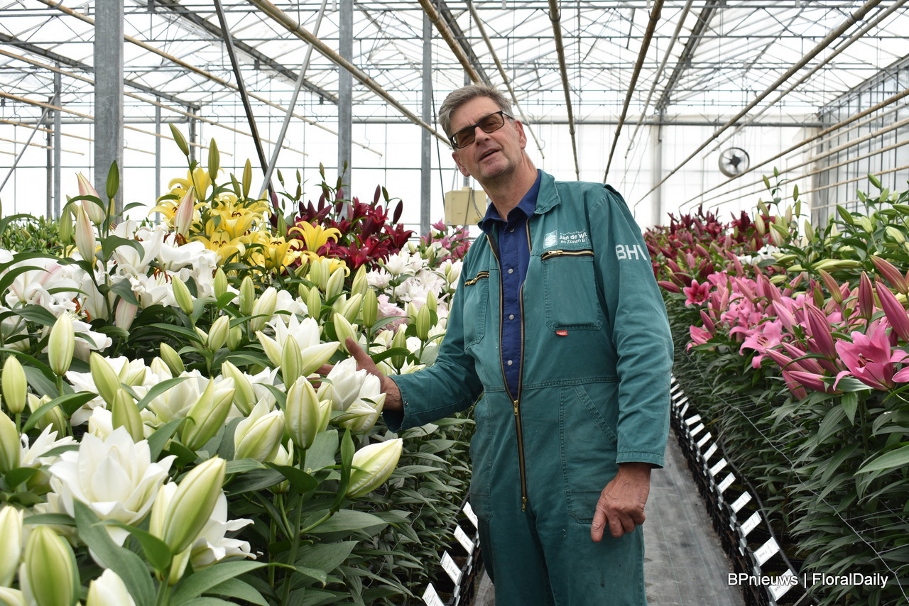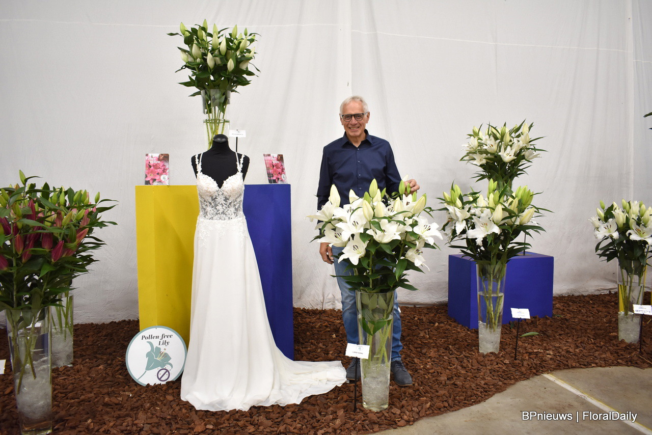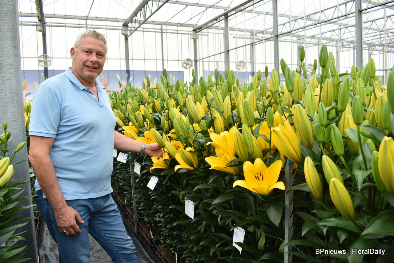 Wijnand van der Kooij van De Jong Lelies naast Liber Lily, een serie die samen met Royal Van Zanten is ontwikkeld. Het is een stuifmeelvrij ras dat nog steeds zijn stampers heeft.