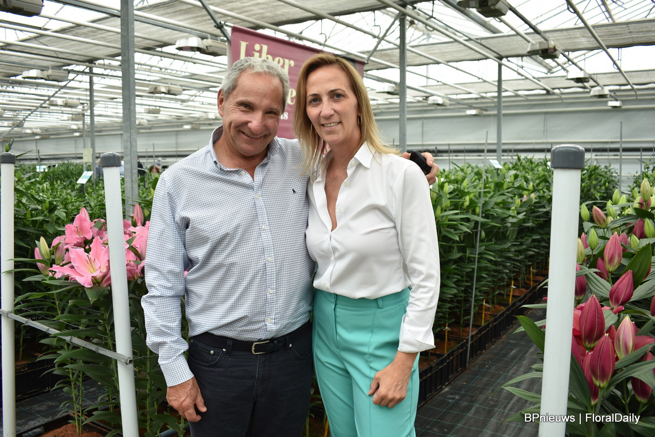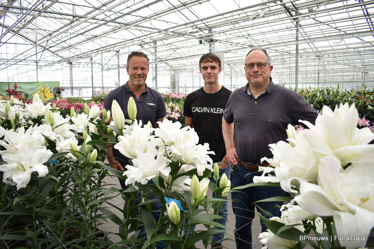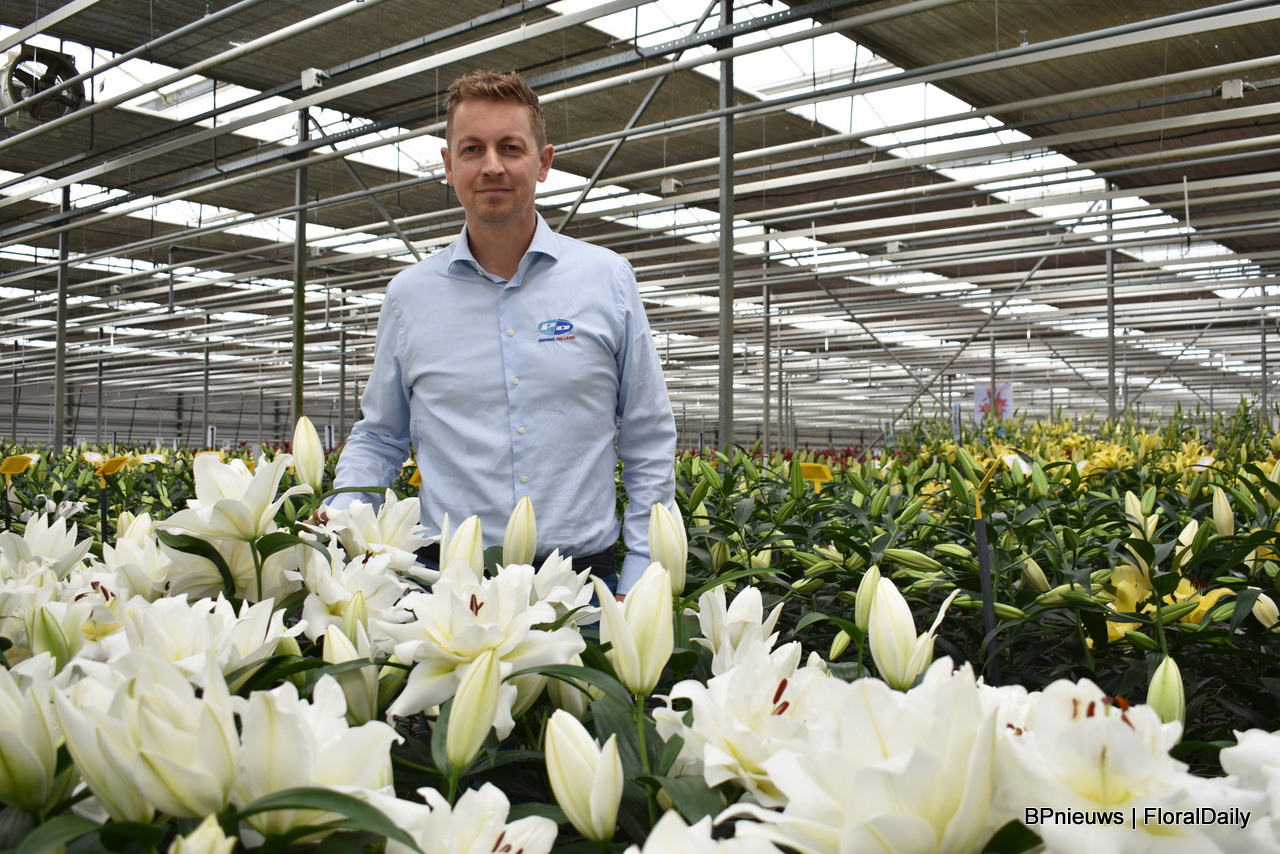 Wijnand van der Kooij van De Jong Lelies naast Liber Lily, een serie die samen met Royal Van Zanten is ontwikkeld. Het is een stuifmeelvrij ras dat nog steeds zijn stampers heeft.