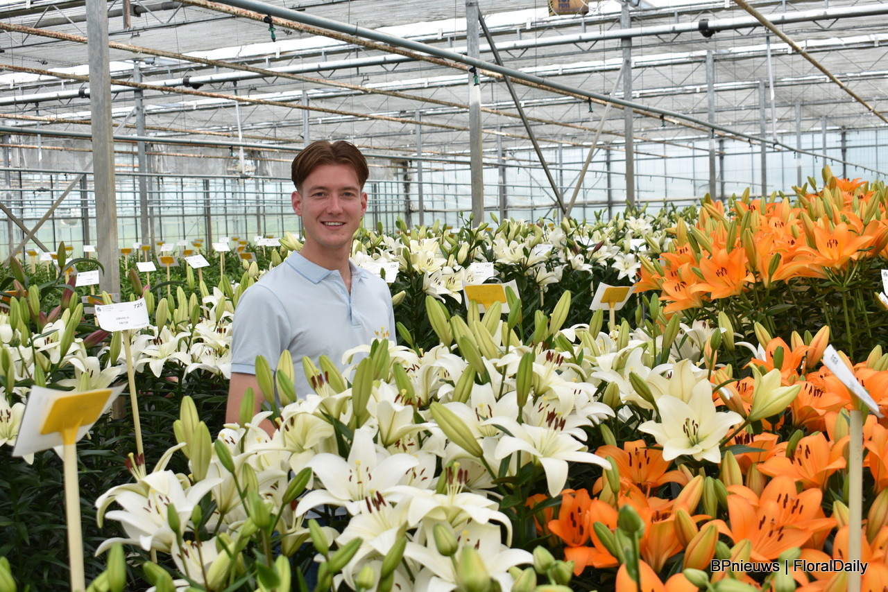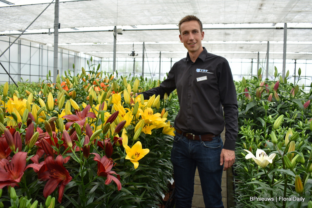 Joost De Jong van VWS met Downtown, een nieuw ras in de TA-serie. De laatste tijd neemt de populariteit van de TA-lelies weer toe door de introductie van nieuwe goede rassen.