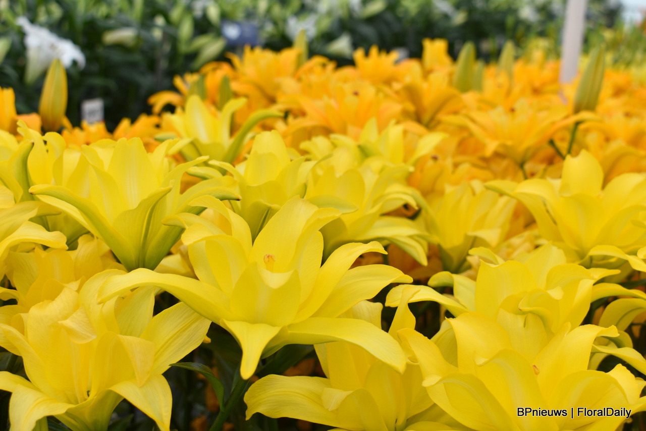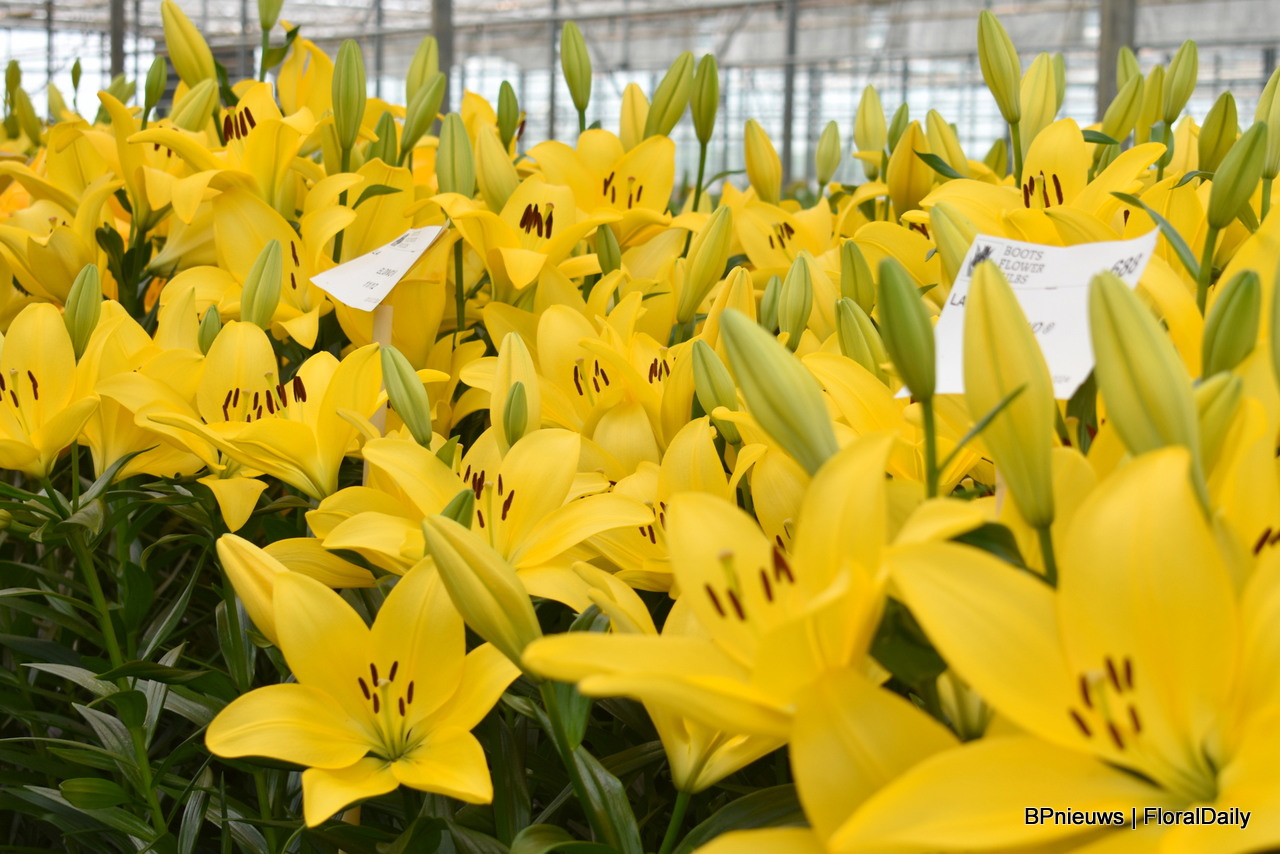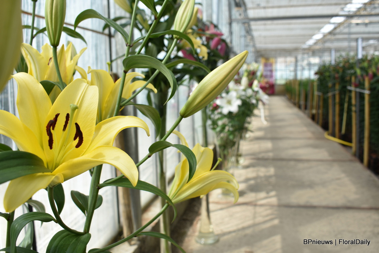 In de kas presenteren ze de variëteiten die ze in hun assortiment hebben, waaronder deze gele LA's.