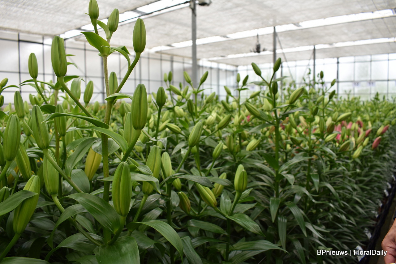 Bij Van Den Bos. In deze kas zijn ongeveer 3400 lelies geplant.