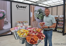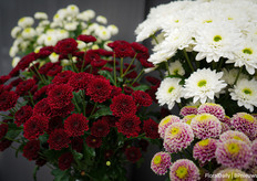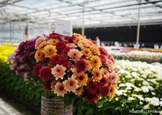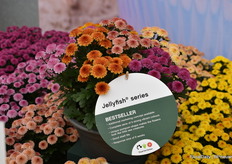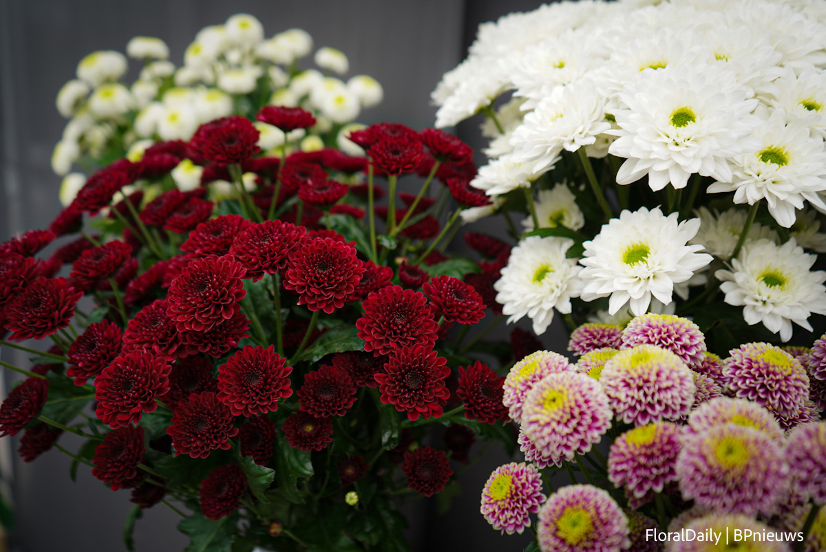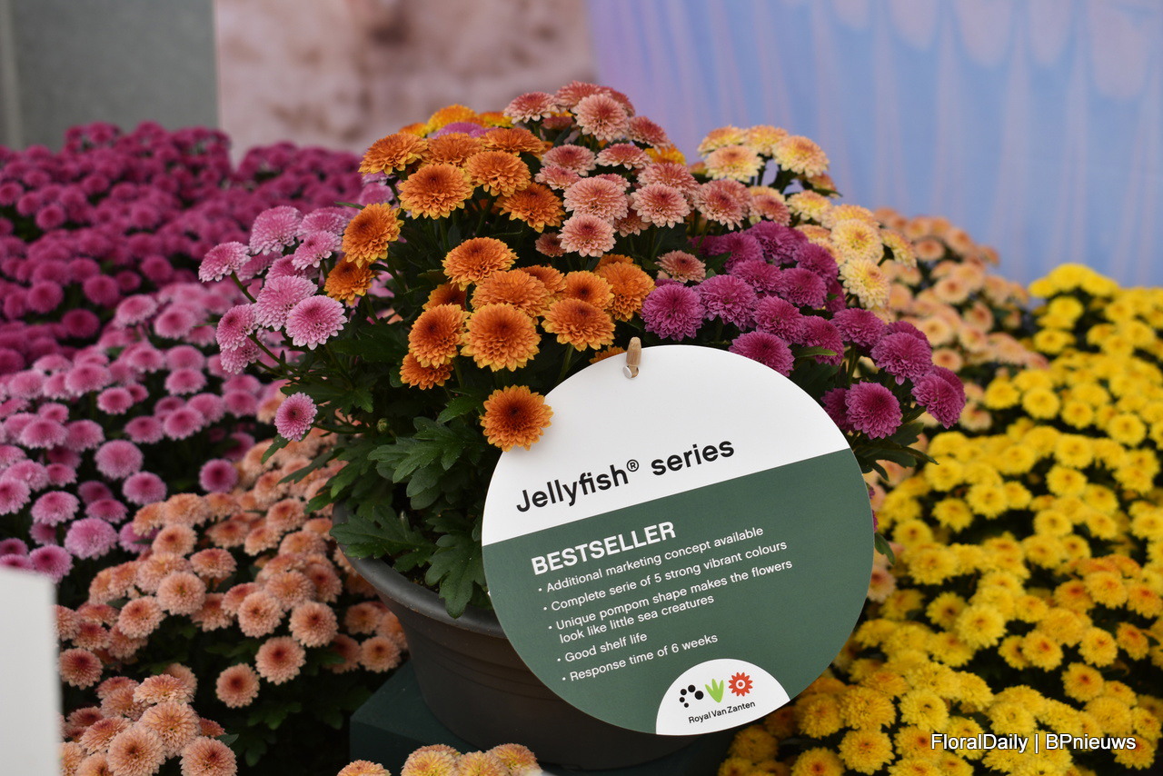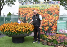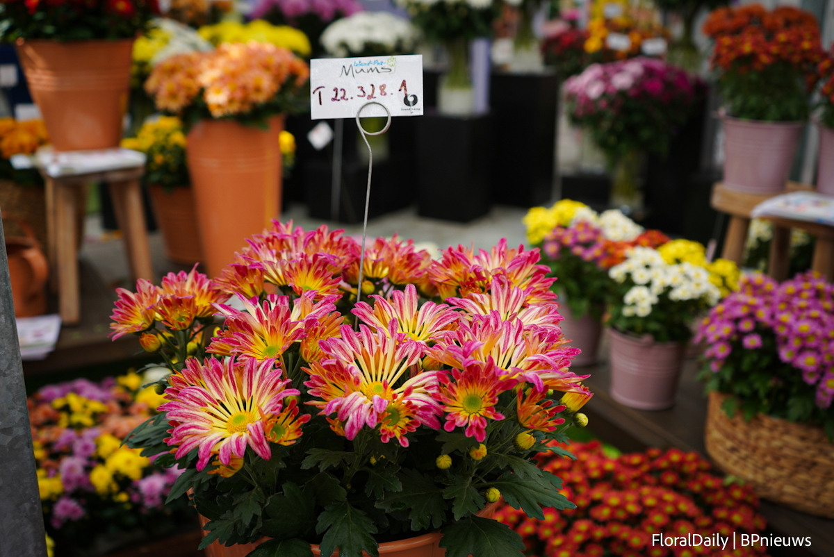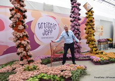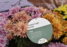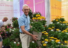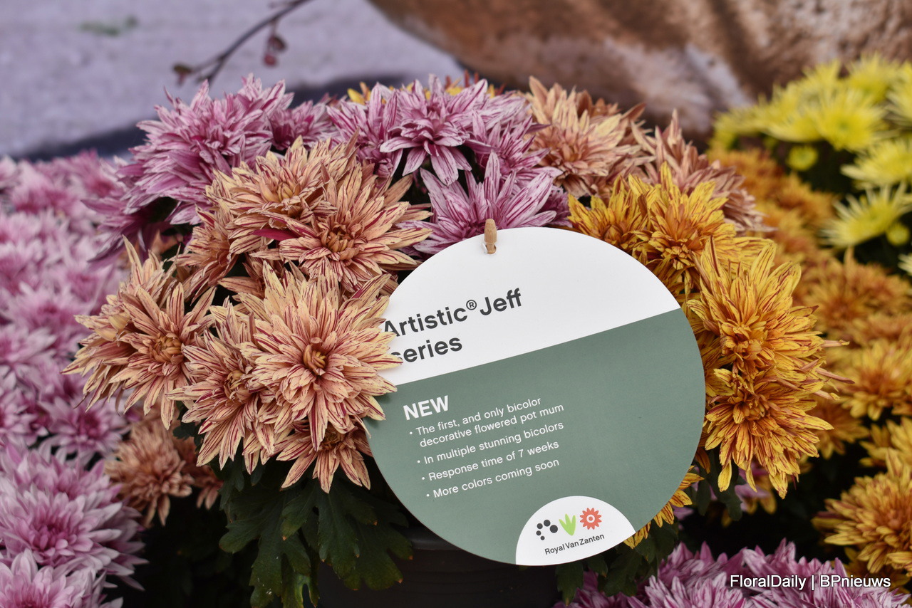 Bert Koese van Royal Van Zanten met Artistic Jeff, een pot chrysant die een tweekleurige dubbele bloem heeft. Het is een echte familie waardoor je goed kan mixen.