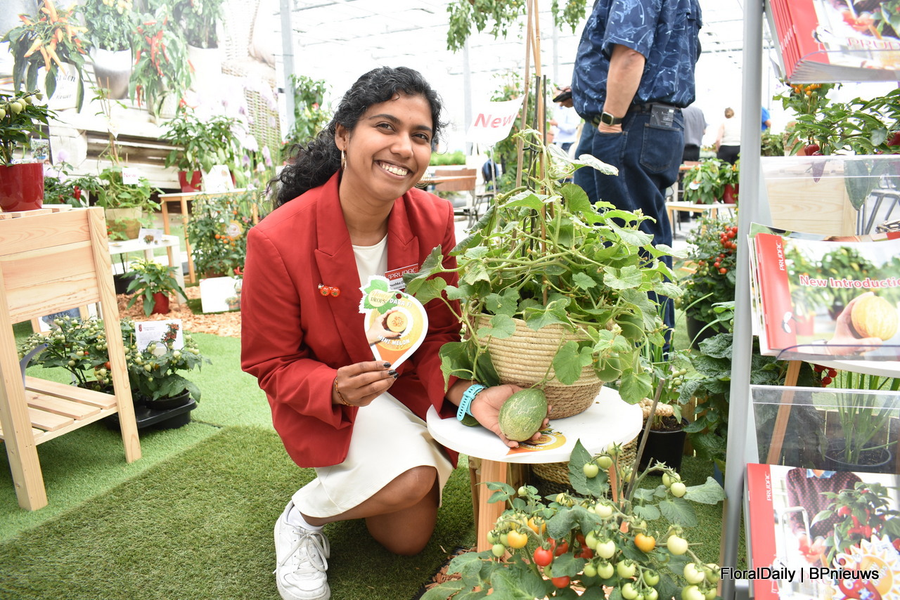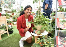 Anushka Deshpande, tomaten veredelaar bij Pridac, met de mini meloen Honey F1 Drops Dara. Een meloen voor de hobby tuinder.