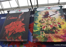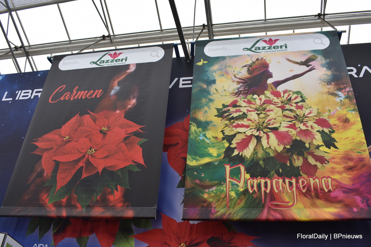 Carmen en Papagena van Lazzeri. Carmen is Lazzeri's nr 1 variëteit in de poinsettia collectie en Papagena is een nieuwe introductie voor 2025.
