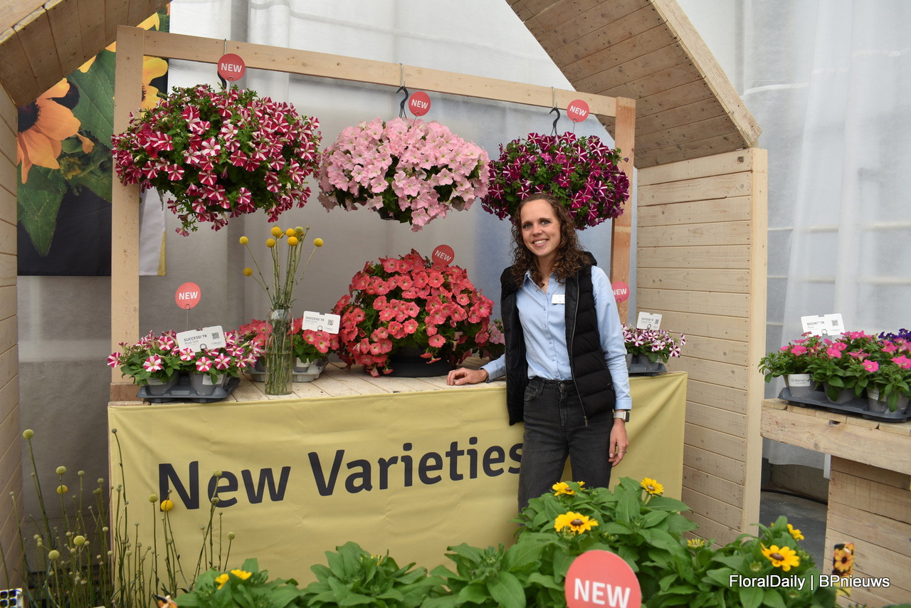 Amelie Merschmann van Benary naast de nieuwe petunia Success TR. Vier nieuwe kleuren in de serie, 2 ster types en 2 Morn types