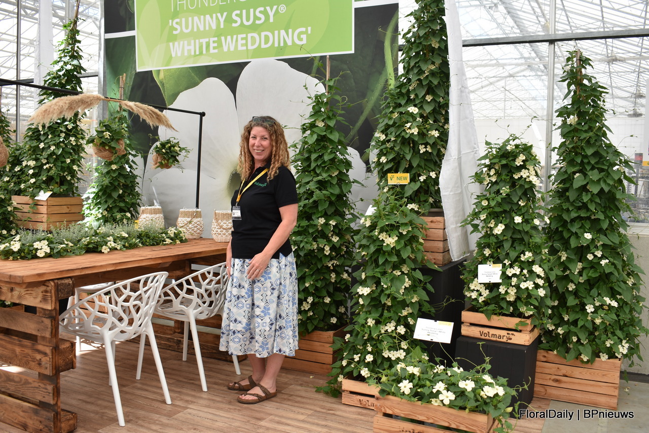 Elain Whelan van Volmary met Thunbergia White Wedding. Bijzonder aan deze varieteit is dat deze geen zwart oog heeft, zoals de meeste Thunbergia's.