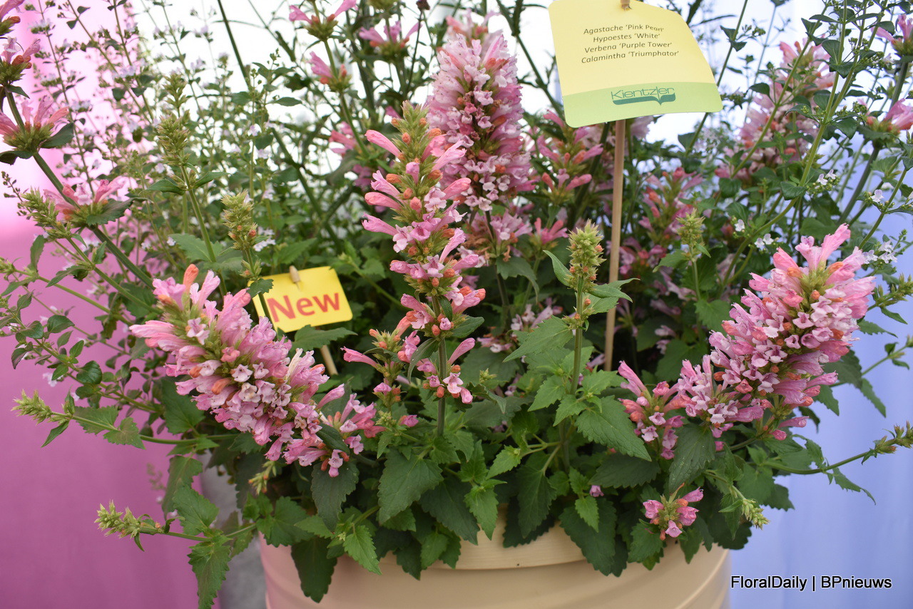 Agastache Pink Pearl van Kientzler bloeit lang, een aantal maanden en is een rebloomer, doet het goed in kleine en grote potten, trekt insecten en is geurend.