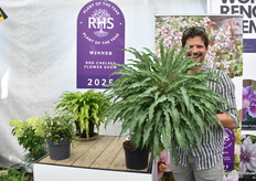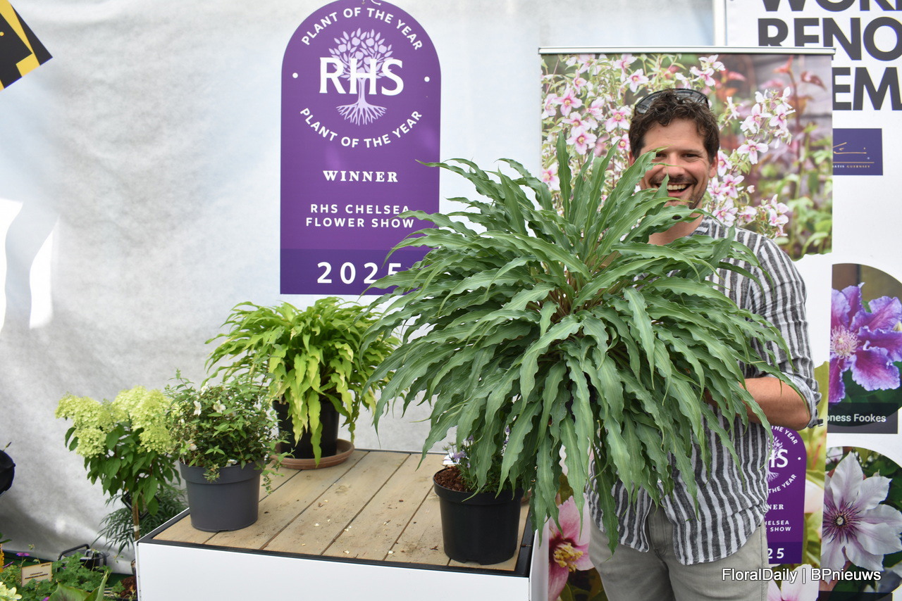 Peter Rijssen met Hosta SIlly Strin, die de tweede prijs won tijdens de RHS Plant of the Year.