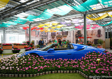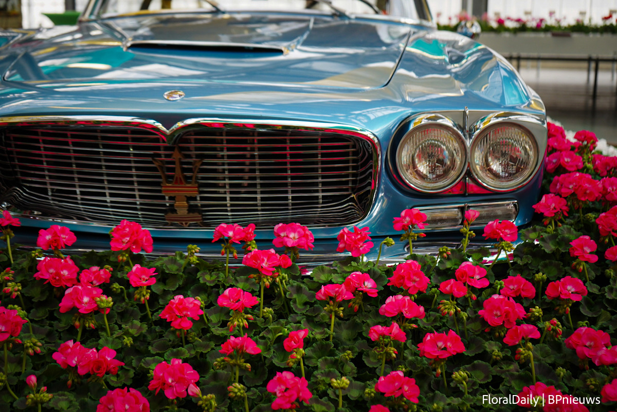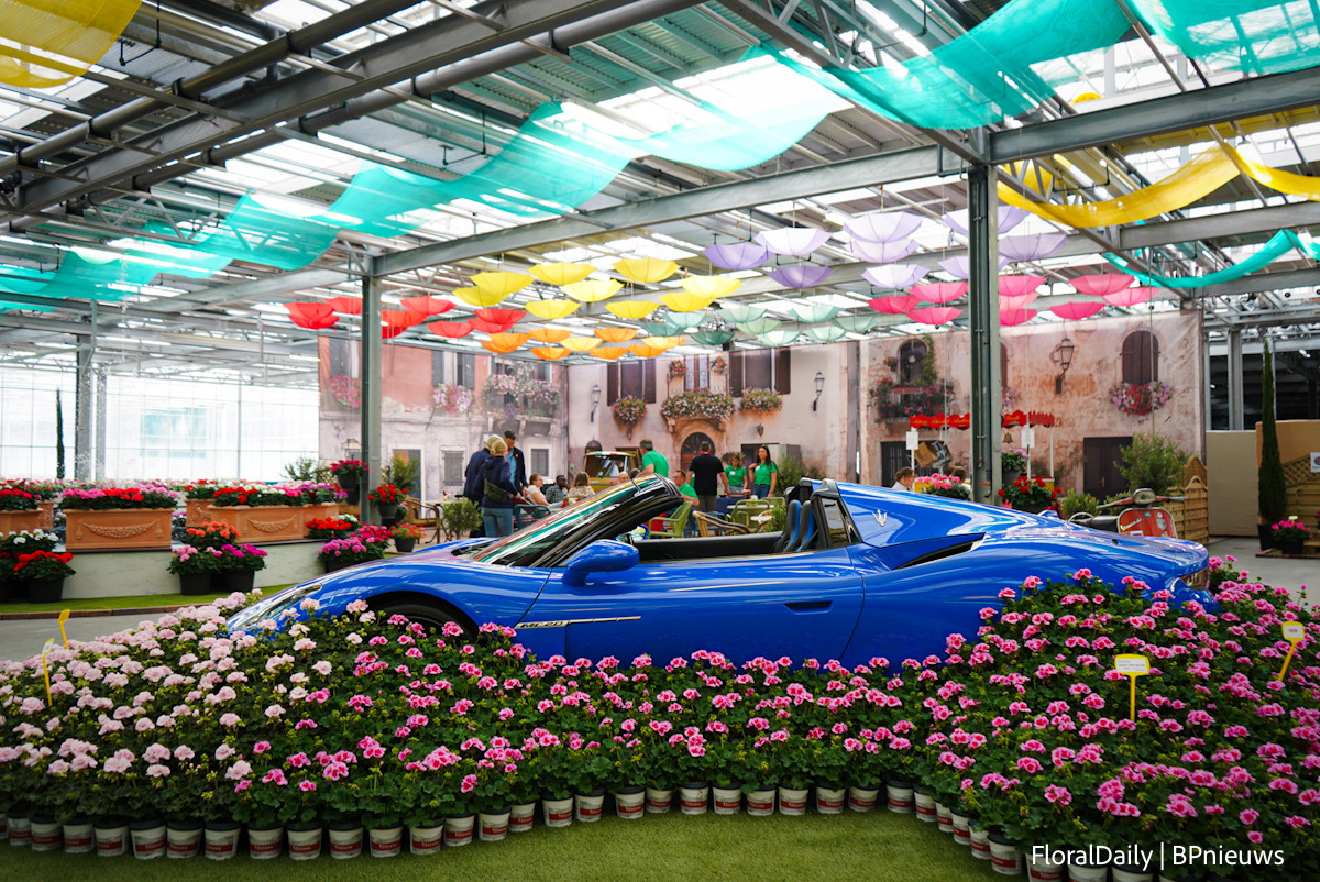 De loods was bijna niet te herkennen, het leek net een Italiaans bloemenfestijn mét twee Maserati's.