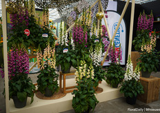 Digitalis DiBella in vier kleuren: paars, peach, white en creamy white. In januari zijn ze gezaaid en gelijk in het eerste jaar in bloei. Het is een biannual maar ook planbaar qua zaai. Volgend voorjaar komt deze in de verkoop.