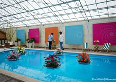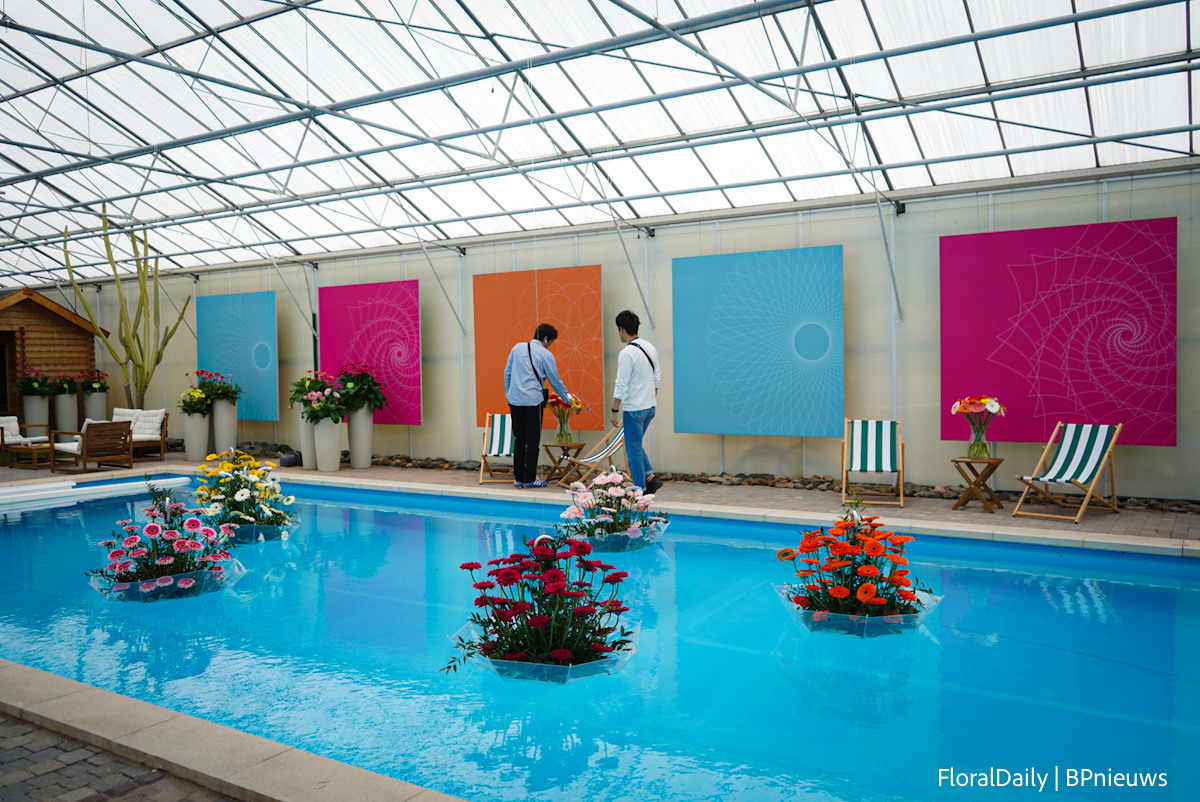 Ronddrijvende gerbera's in het zwembad bij Schreurs