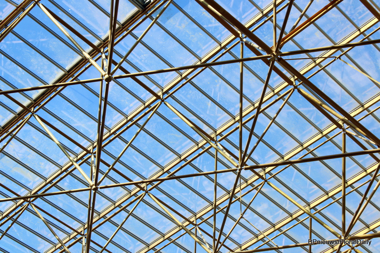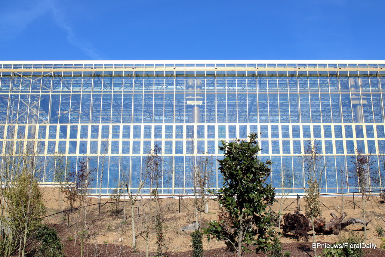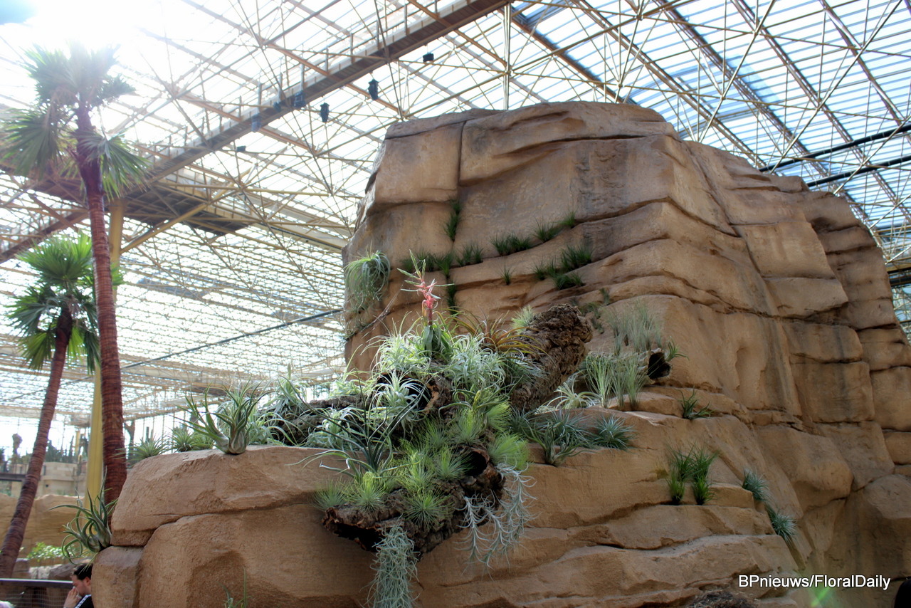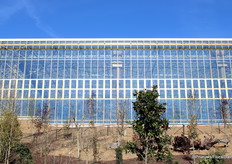 Achter deze waterval is een lift waarmee medewerkers het dak van de kas kunnen bereiken