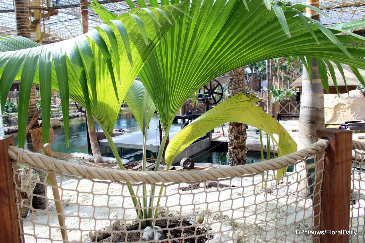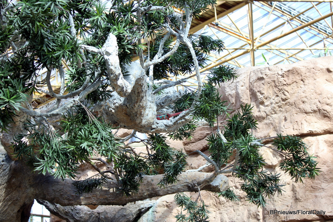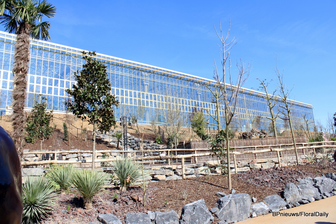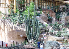 Achter deze waterval is een lift waarmee medewerkers het dak van de kas kunnen bereiken