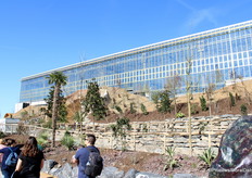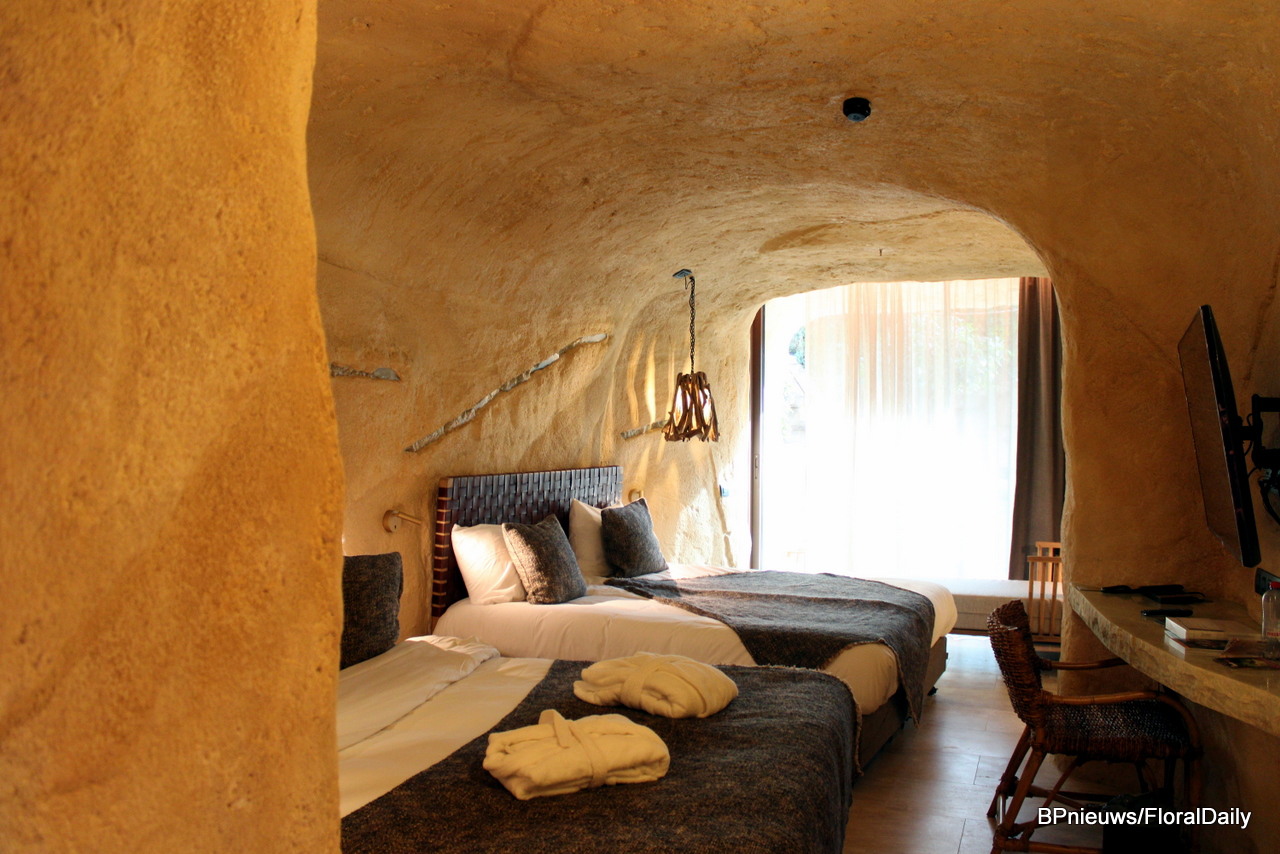 Het is zelfs mogelijk om in de tropische kas te slapen. Onderin zie je de hotelkamers verwerkt in de rotsen