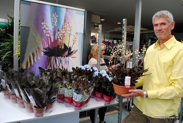 Peter Hofstede van Kwekerij de Hofstede laat de grote, zwarte phalaenopsis zien die hij in potmaat 15 levert.