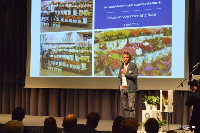 Eric Moor vertelt de zaal over de uitdagingen Decorum van handelsmerk tot consumentenmerk te maken.
