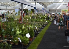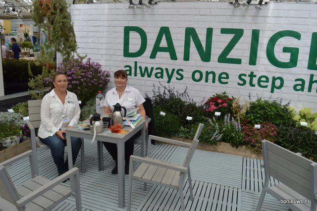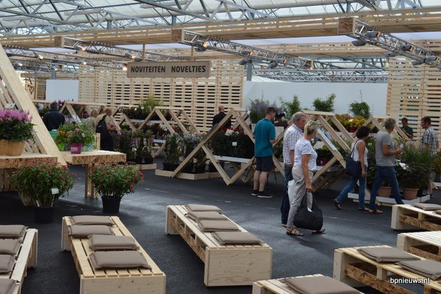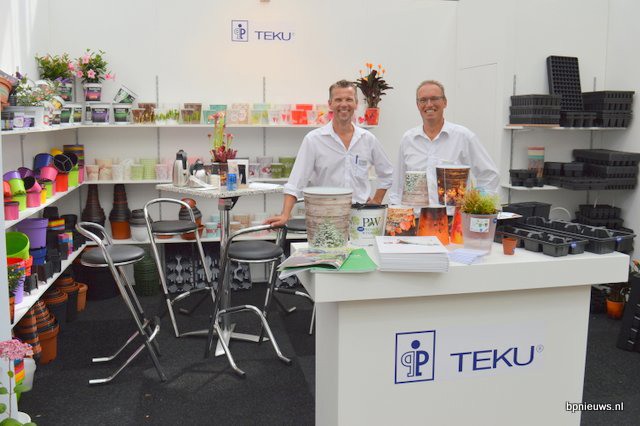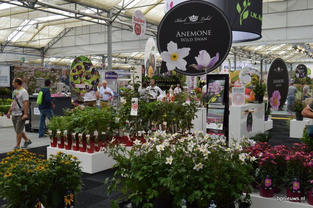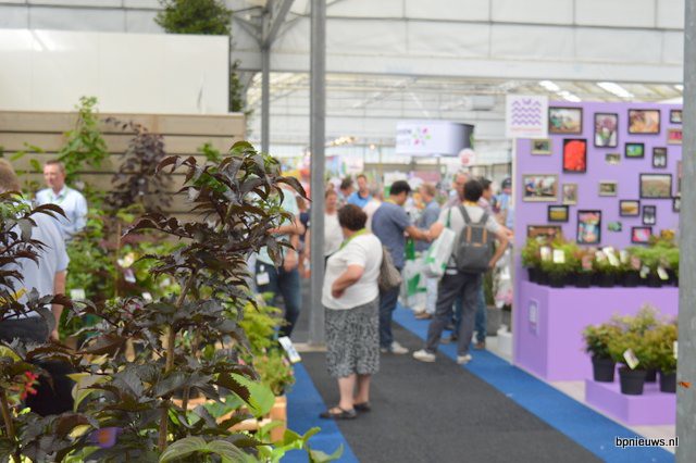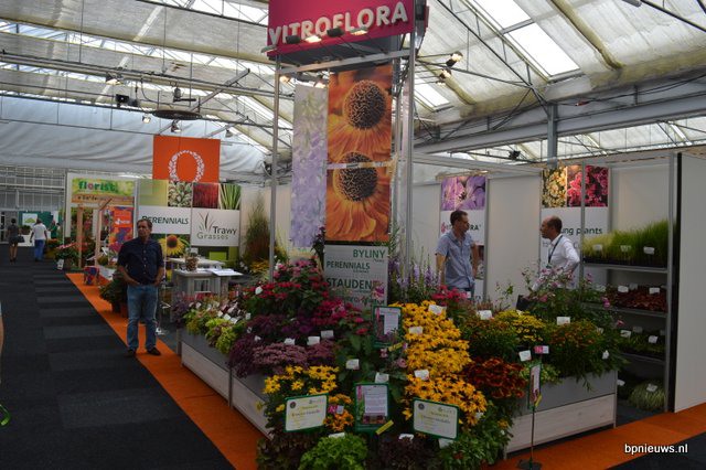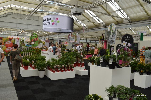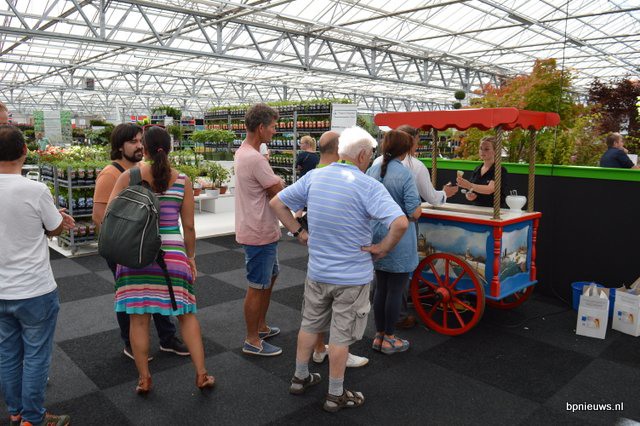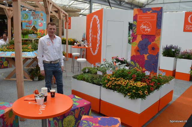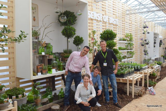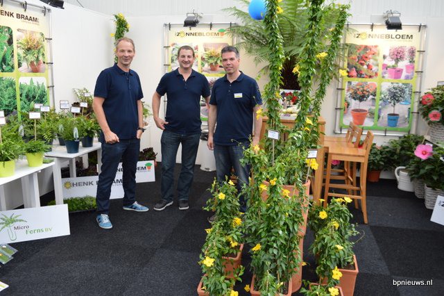 De Zonnebloem jubileert en staat dit jaar voor de 25ste keer op Plantarium. Links Bart en Cris Oostveen, rechts Henk Braam.
