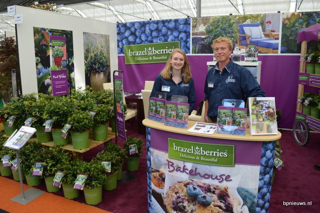 De Brazel Berrie komt uit Amerika, alwaar meneer Brazel twintig jaar gewerkt heeft aan de ontwikkeling van de plant. Het resulteerde in een plant die zowel gedrongen blijft als veel vruchten geeft - een unieke combinatie. De Jong Plants heeft de rechten en introduceert de plant nu op de Europese markt. Op de foto Julia de Jong en Arie Vermeulen