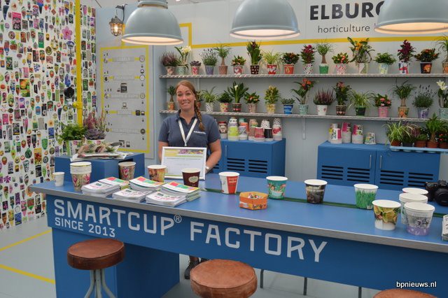 Marjolein Belt van Elburg Smit. Op beurzen flaneert het bedrijf de laatste tijd met 'de smart-cup factory' - een tafel met daarin een lopende band, waarop de 'smart-cups' paraderen