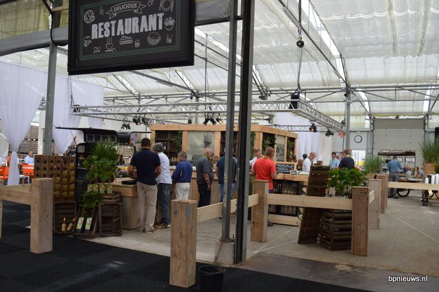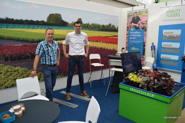 De heren Erfgoed - Machiel Paans en Corné Verduijn, presenteren natuurlijk hun expertise op het gebied van teeltvloeren. Maar ook voor het vergemakkelijken van intern transport met trolleys heeft men oplossingen in huis, zoals aluminium spoordelen (te zien op de grond).