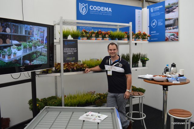 Jelmer Huizing van WEVAB Codema, zogezegd de hardware producerende tak binnen de Codema Group. De stelling op de achtergrond is ontworpen door Romeo Sommers en beschikt overal allerlei voordeeltjes en gemakken die hem voor een tuincentrum erg aantrekkelijk maakt.