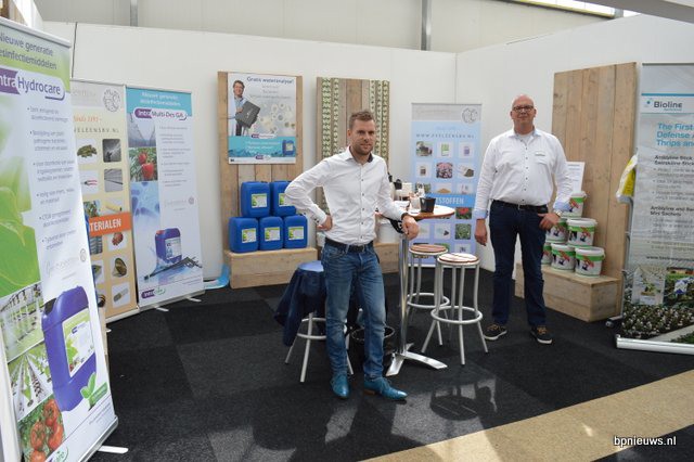 Maarten van Haagen van Houwelings en Ronald Vervloed van Gebr. Eveleens. Beide bedrijven werken veel samen en presenteren daarom gezamenlijk de oplossingen op het gebied van gewasbescherming en waterzuivering.