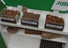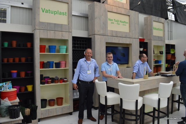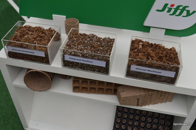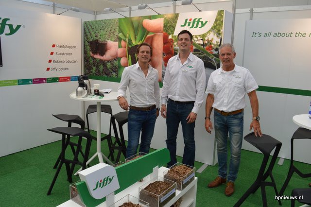 Vlnr: Dennis Colpa, Lars Tolenaar en Ton van Wetten. Op de beurs presenteerde Jiffy enkele nieuwe afstrooi mixen. Dit zijn relatief nieuwe producten in de potplantenteelt. Men strooit er iets van op de aarde rondom de plant, opdat onkruid en mossen de pas wordt afgesneden en er ook minder water verdampt. Jiffy is hierin een van de koplopers en zeker in de regio Boskoop geen onbekende.