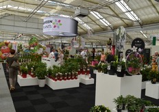 Nieuw op de beurs dit jaar is Duif International. Samen met het bedrijf Pottery Pots kregen zij een mooi stukje beursvloer toegewezen, alwaar arrangeur Judith Frankrijker het voorbijkomende publiek met 1001 ideeën verraste. Vlnr: Marco Hartensveld (Duif International), Judith Frankrijker (arrangeur), Ruud Jonkheer (Duijf) en Cees van Goor (Pottery Pots)