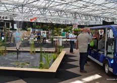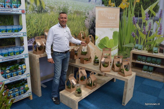 Jan van Walsem van Waterplantenkwekerij Moerings. De Vijvervaas is een van de neiuwe concepten - een glazen vaas, reeds gevuld met planten en water (dat bovendien met een speciaal apparaatje helder wordt gehouden), dat in een handige kartonnen draagzak in het winkelschap geplaatst kan worden.