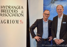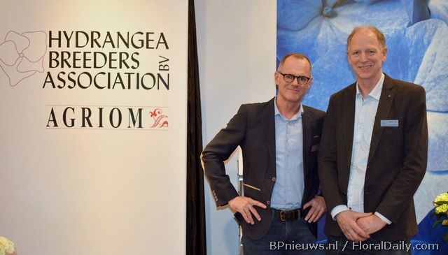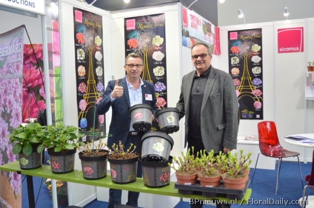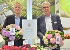 Jean-Yves Coulbault and Christophe Camus from Sicamus presenting the new printed Tcontainer for hydrangeas. The containers are available for the Rendez Vous, Dutch Ladies and You and Me series of Sicamus, but also for classic varieties. The reason for supplying these pots is the ease for end consumer in the garden center (who will quickly see what kind of hydrangea they are buying) and the grower can now add value to their product as most of them are currently not using these kind of Dekopots.