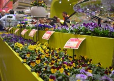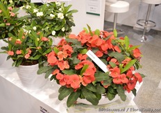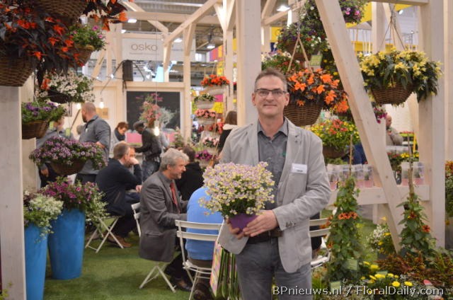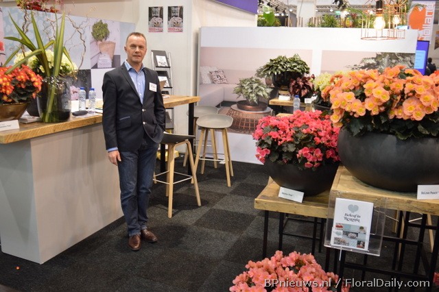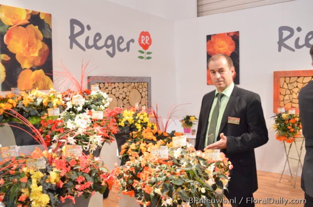 Matthias Rohde from Rieger Begonien showing the Rise Up and Shine Bright begonias. The Rise Up begonias are finished 1 to 2 weeks faster. Besides it hase flowers on top of the plant when in a basket, which is quite rare for begonias in a basket. According to Rohde, the demand is good.