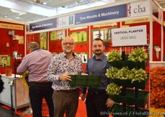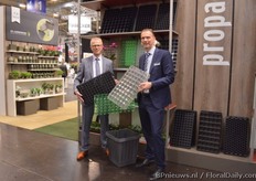 Kees Waque and Pascal Rossen of Desch Plantpak presenting three of their novelties; a new orchid tray (the one Rossen is holding), paperpot tray (the one Waque is holding) and the Aqua Max (the container on the floor).