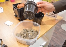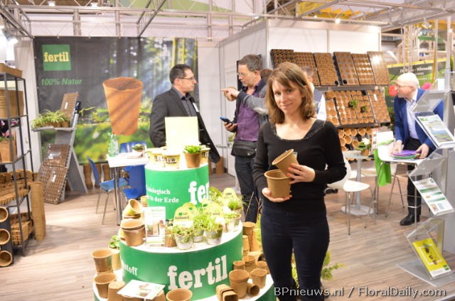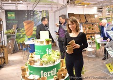 "Sandra Villete Sigault of Fertil presenting the Ner Fertil pot NT. This pot is made of the same material of the pots that they are supplying for several years (wood fibre) but it is produced differently. Now, the pot has a smoother structure and is therefore better stackable which enables mechanisation of the product. The pots are available in three sizes; 10.5, 12 and 14 cm. "It can be used like plastic, but it is still organic, 100% biodegradable". More on this later on FloralDaily."