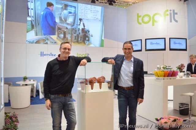 Björn Stiening and Ronald van Dijk of Henke Kunststoffe presenting their new pots with a new design on the bottom which enables the roots to develop better. More on this later on FloralDaily.