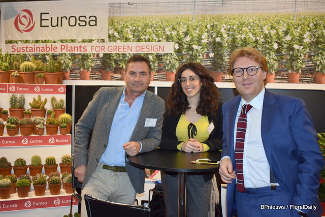 Nino Centrone, Nadia Somine en Paolo Ciccolella van Eurose kwamen helemaal uit Italië om hun verschillende planten te laten zien op de beurs. Links zie je hun Cactussen.