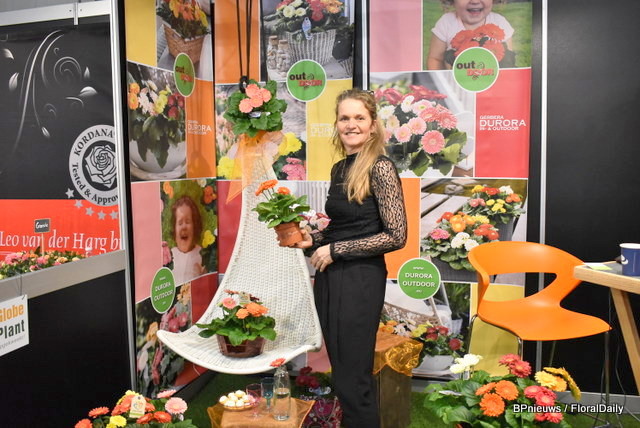 Vera Grootscholten van Globeplant met de Durora, een in- en outdoor gerbera. Nieuw dit jaar is de bedrukte pot.