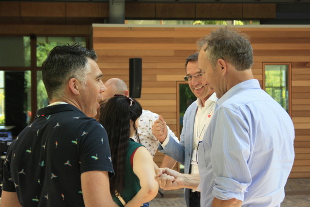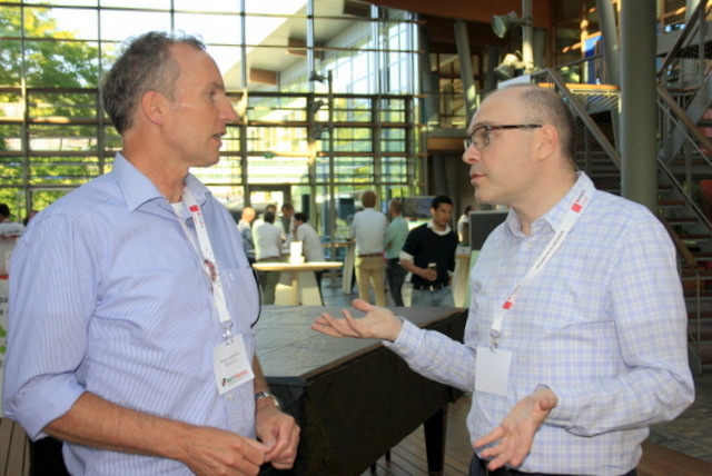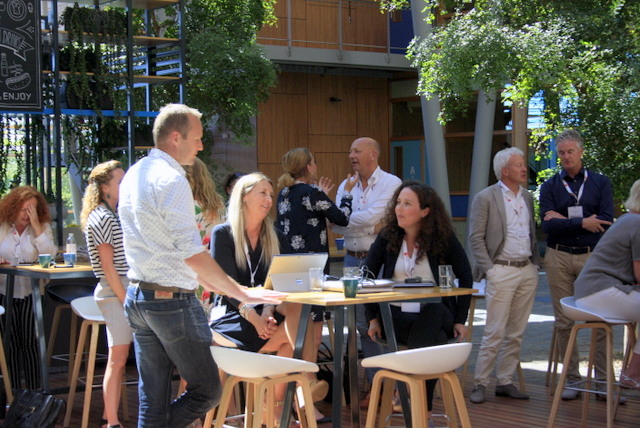 Arno Zerhusen van Pöppelmann in gesprek met Mark van Antwerpen van Royal Brinkman, die een van de deelnemers is van het Academy-programma.