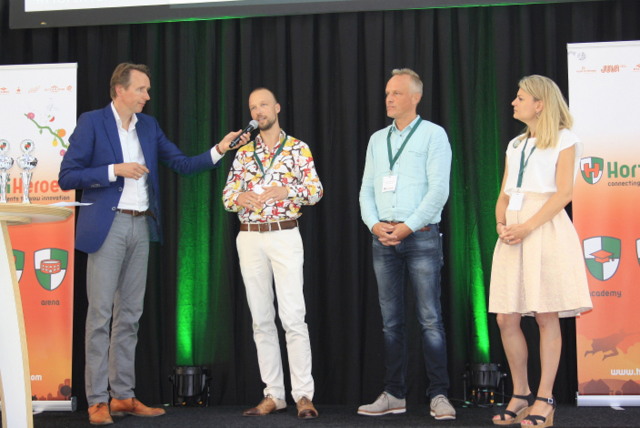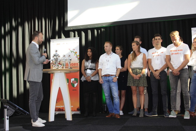 Juryvoorzitter Michael van Lier maakt bekend welk team de winnende pitch heeft gegeven.