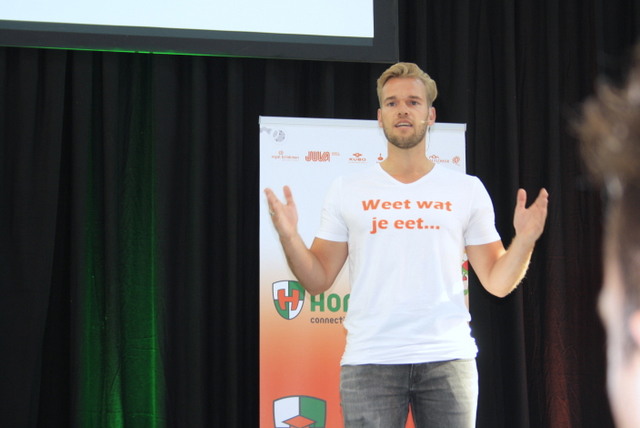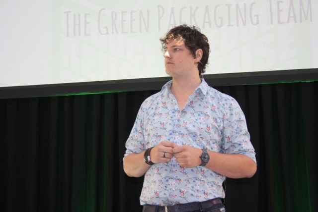 Jeroen Steenbergen pitchte namens The Green Packaging Team over het verminderen van plastic door oceaanplastic her te gebruiken.