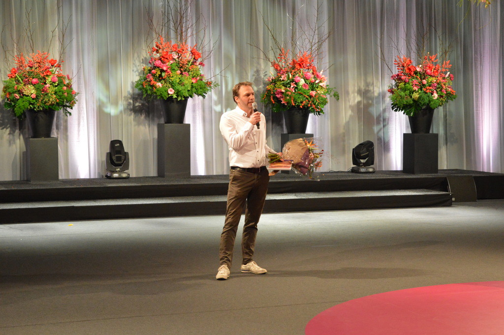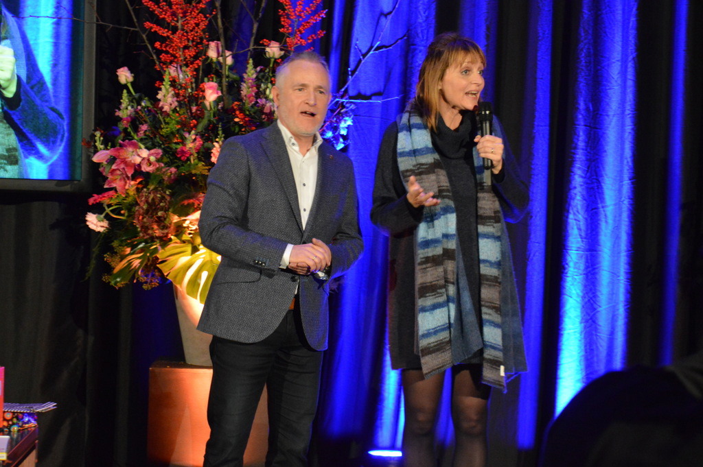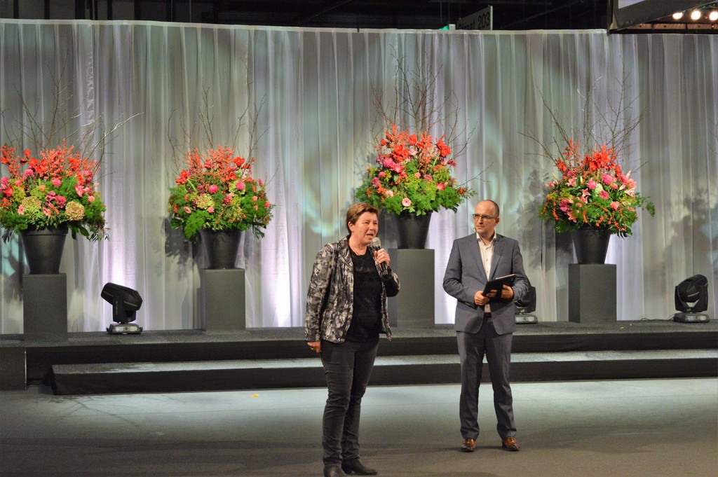Bert en Mariëlle Rutten van Gijsbers Tuinbouw. Mariëlle ontving een bloemetje, als dank voor haar bijdrage in de voordrachtscommissie