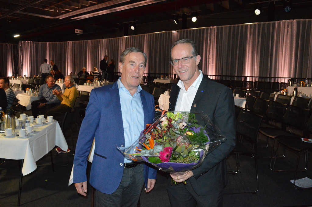 Jos Kester (Plantion) en Martien van der Weijden (Excelent Orchids), de gelukkige eigenaar van maar liefst twee bossen bloemen als nieuw lid van de ledenraad en aftredend lid van de ALV-commissie.