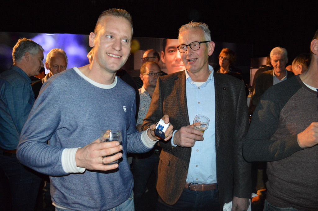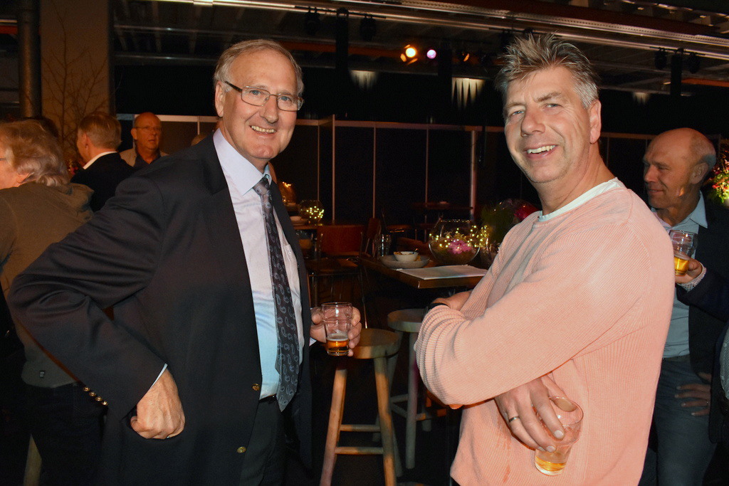 Arend Vreugdenhil met het hem zojuist opgespelde speldje - hij maakt per 1 januari deel uit van de ledenraad - en Koos Bos