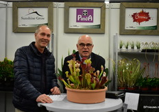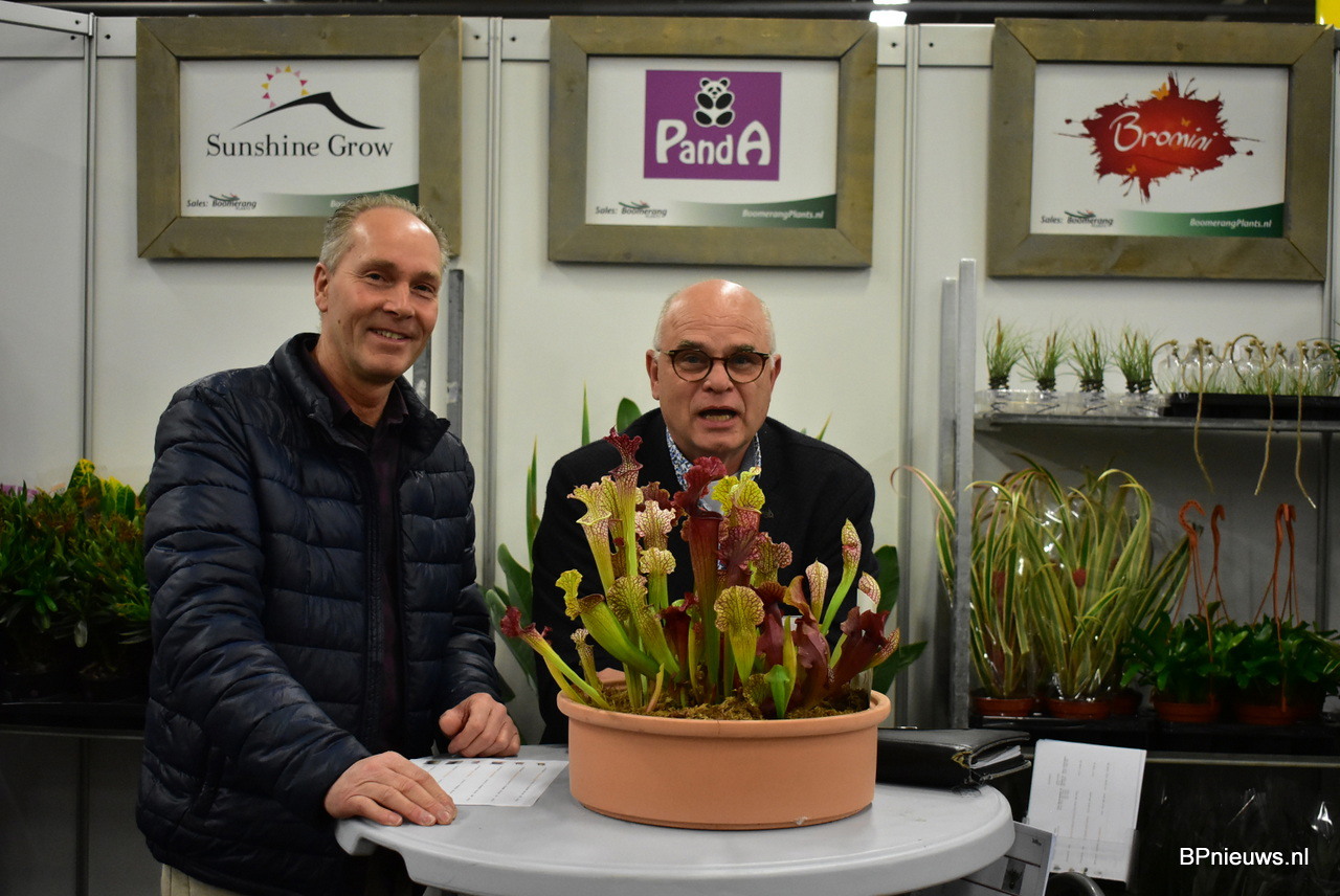 Jan Ekelmans van Boomerang Plants en Michel Tax van Veiling Rhein Maas met op de tafel een mooie vleesetende plant van kwekerij Stricker.