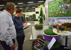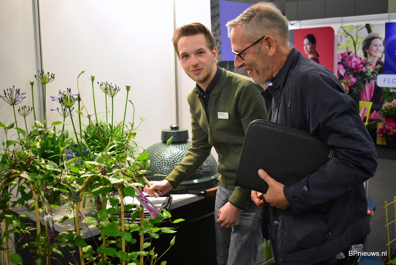 Er werd lekker geschreven in de stand van Kwekerij de Rijke. We zien hier Gerard Voois samen met klant die zijn order samen stelt.