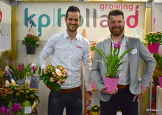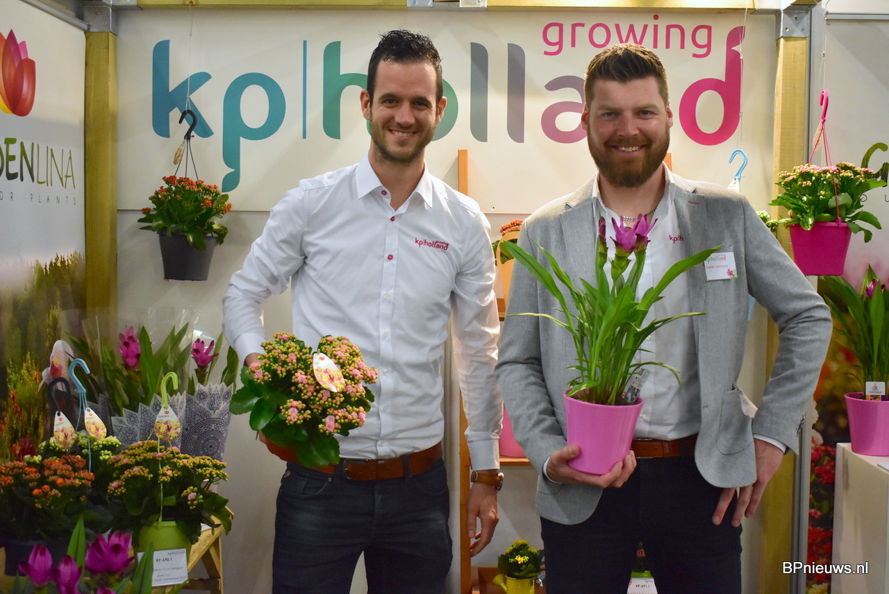 De mannen van KpHolland, links Pim van der Knaap met een Kalanchoë Garden Lina potmaat 15 en rechts Waleter Gunneweg met een Curcuma Siam Splash potmaat 14. Beide zijn op dit moment leverbaar.