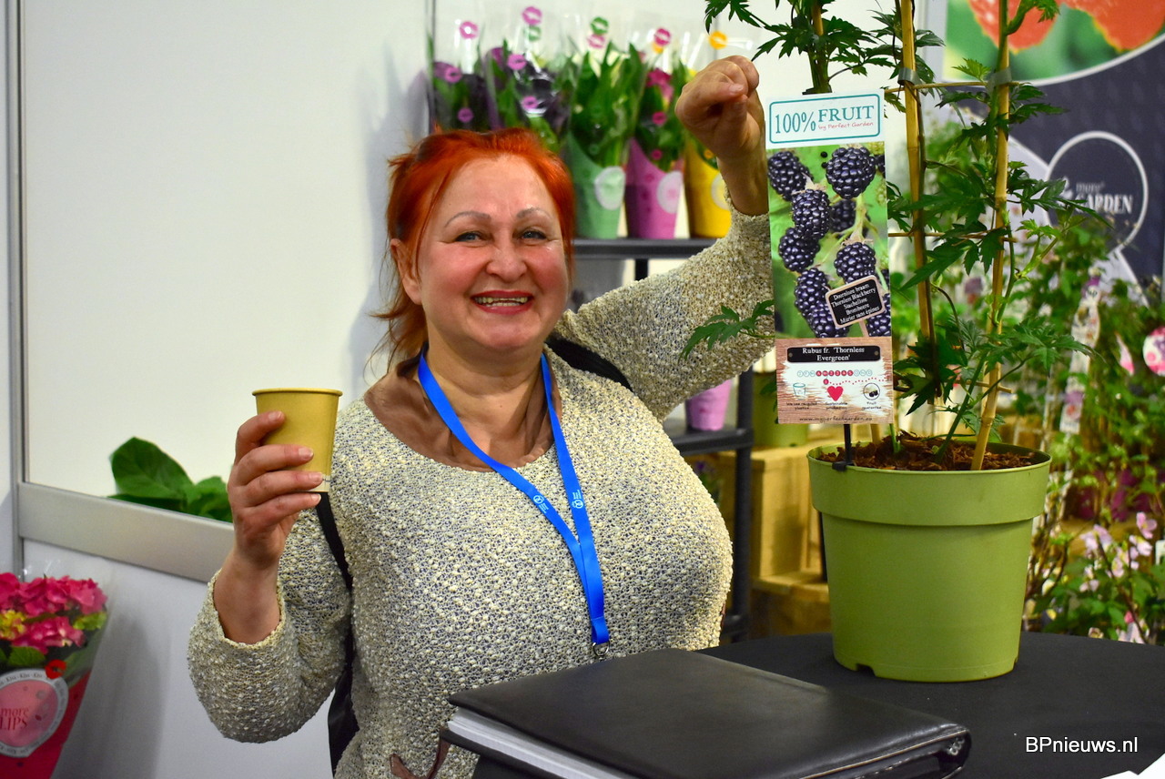 Een enthousiaste bezoeker van de beurs die blijkbaar van bramen houdt.