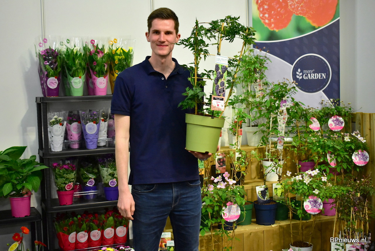 Roald van Wezel van Comfort Plant Group met een mooie, doornloze bramenstruik van hun merk More Garden.
