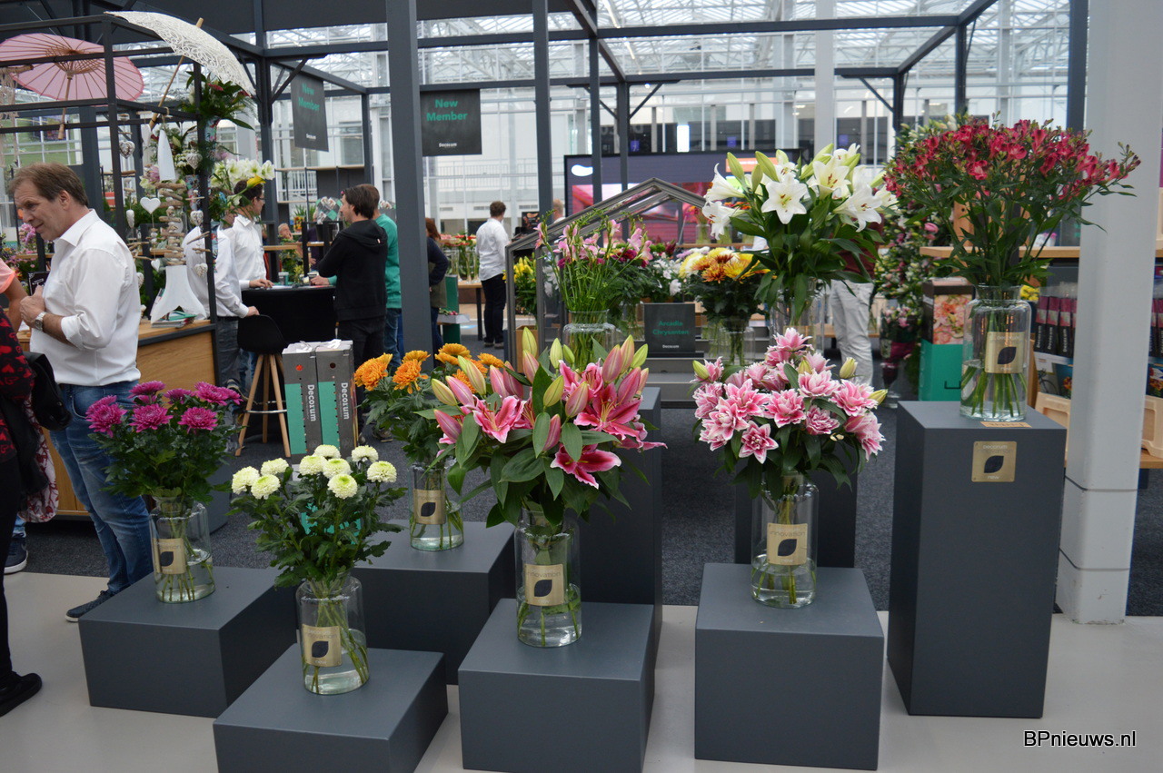 De noviteiten. De vier soorten op de achterste rij, van rechts naar links: Florinca "Cherry" van Together2Grow, Longliflorum "Fredo" van Moerman Lilium, Freesia "Orion" van Hofland Freesia en Chrysant "Bella Vista van Arcadia Chrysanten. De vier soorten op de voorste rij, van rechts naar links: "Roselily Samantha" en daarnaast "Peter Schenk", beide van Moerman Lilium gevolgd door "Alibaba" en "Andrea" van Arcadia chrysanten.