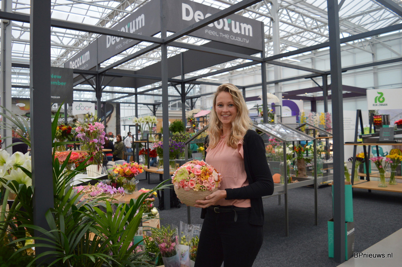 Tamara van den Berg van Decorum met een bloemstuk gemaakt door Floral Designer Hanneke Frankema. Hanneke heeft gedurende de show verschillende bloemstukken gemaakt.