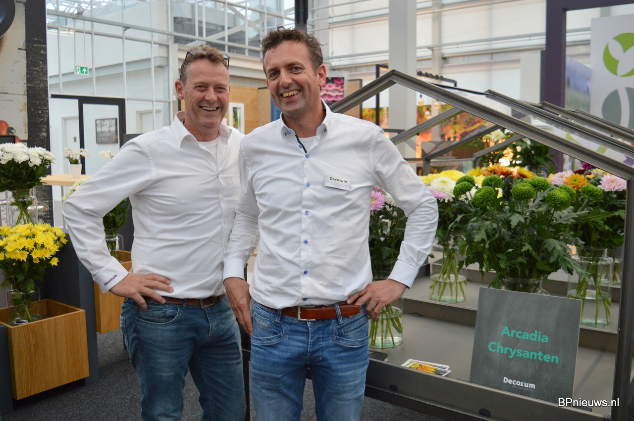 Ronald Olsthoorn en Rene Eikelenboom van Arcadia Chrysanten. In een 23 ha kas worden 25 soorten pluischrysanten geteelt op verschillende locaties in het Westland. Ze zijn momenteel aan het uitbreiden en bezig met de plaatsing van hun zesde kas.